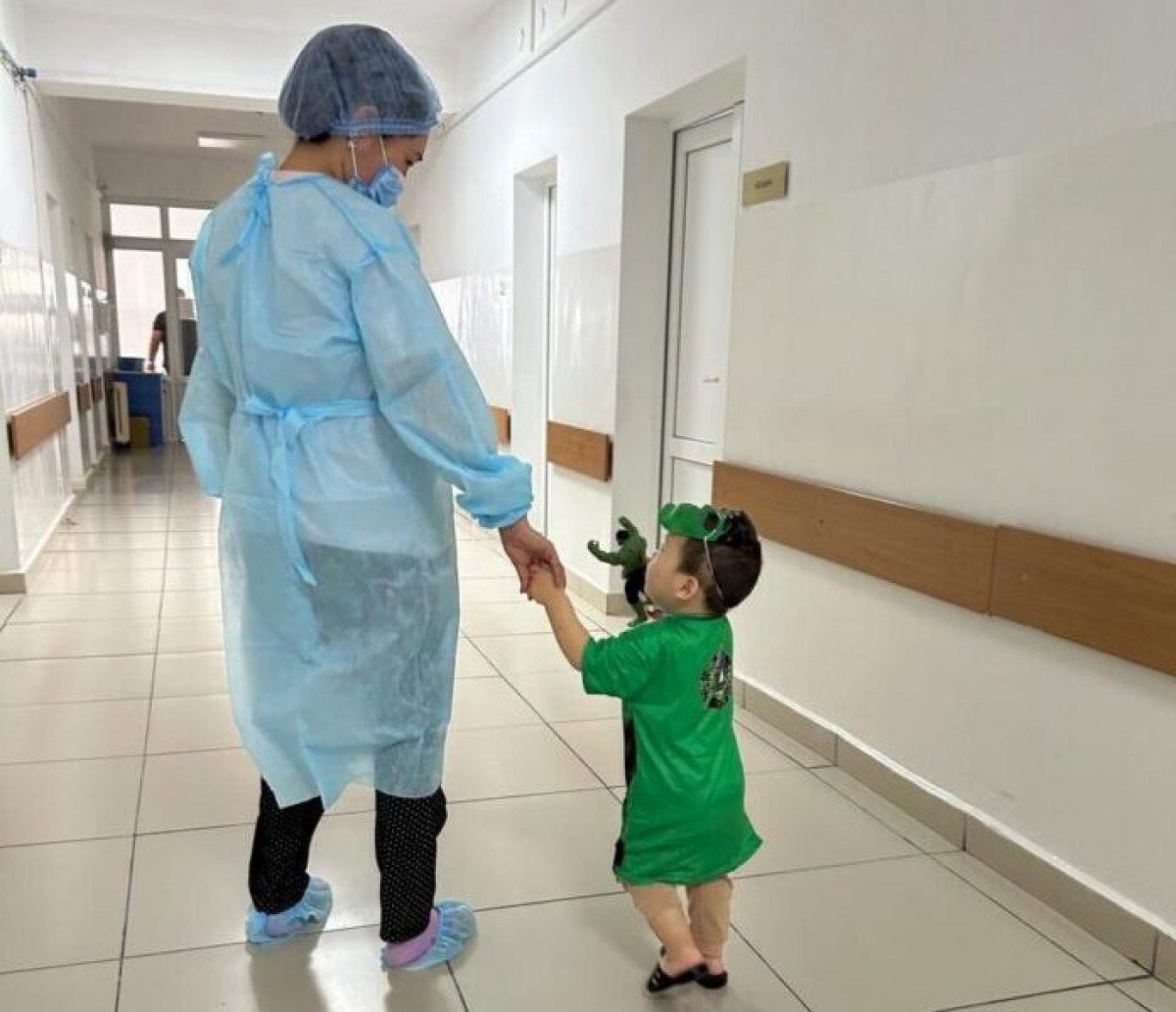 Түркістан облыстық балалар ауруханасының дәрігерлері ота залына балаларды ерекше әдіспен кіргізіп жатыр.