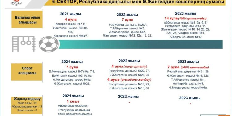 Өткен жылы 4 аула абаттандырылып, ойын элементтері қойылған болатын. Биыл Республика даңғылы №25А, Т.Айбергенов көшесі №2, А.Молдағұлова көшесіндегі №2, Жангелдин көшесінде орналасқан №12, 12а, 18, және 32 көпқабатты үйлердің ауласына балалар алаңы салынады.